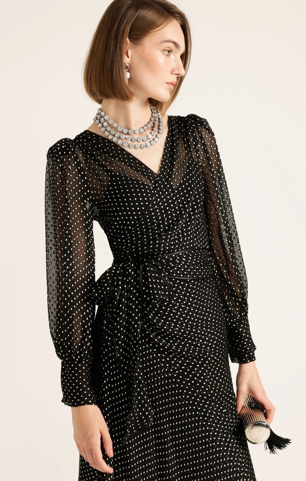 The Calais Wrap Dress exudes elegance with its silk-rayon burnout fabric in a chic polka dot print, complete with our signature wrap design. Featuring a fluted skirt, gathered sleeves, and a slight hi-lo hemline, this ankle length dress is perfect for sophisticated events.