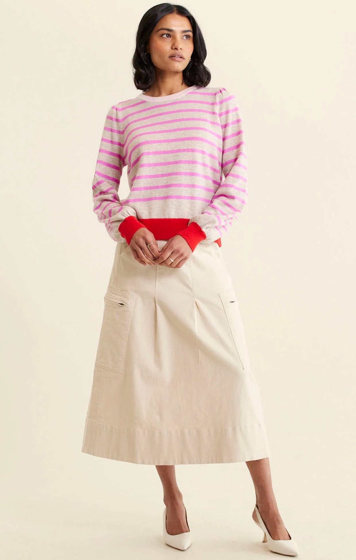 The Cashmere Blend Stripe Knit Jumper by Alessandra is made from a soft wool-cashmere, and features a contrast stripe print, subtle shoulder ruching, and voluminous balloon sleeves. Finished with stretch ribbed trims for added comfort, it’s the perfect piece for weekends and travel.