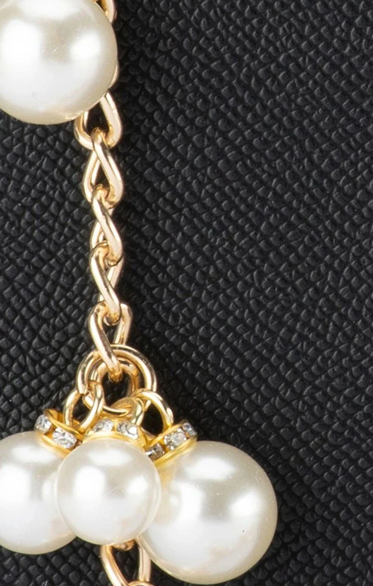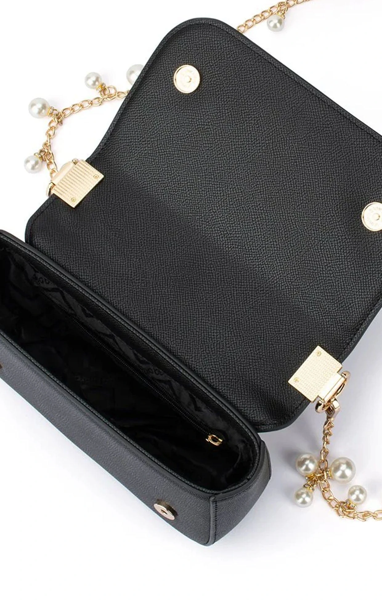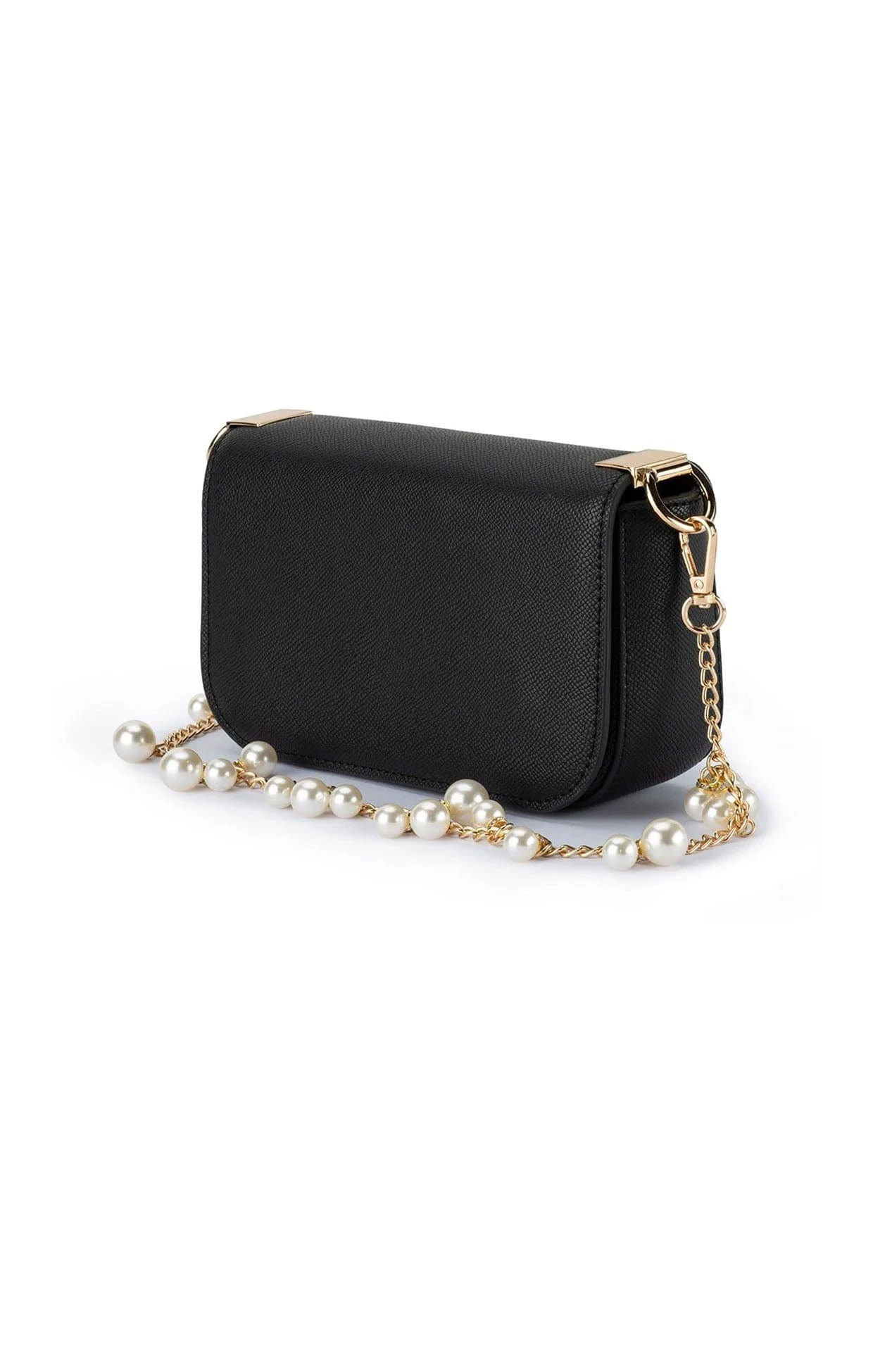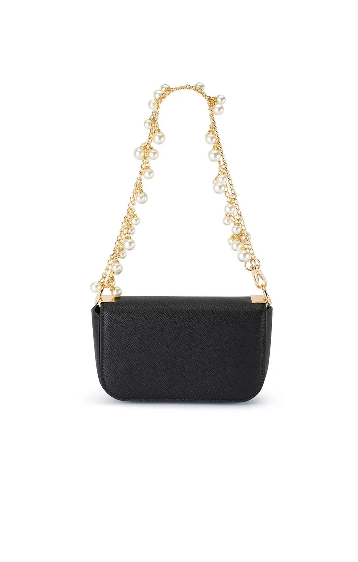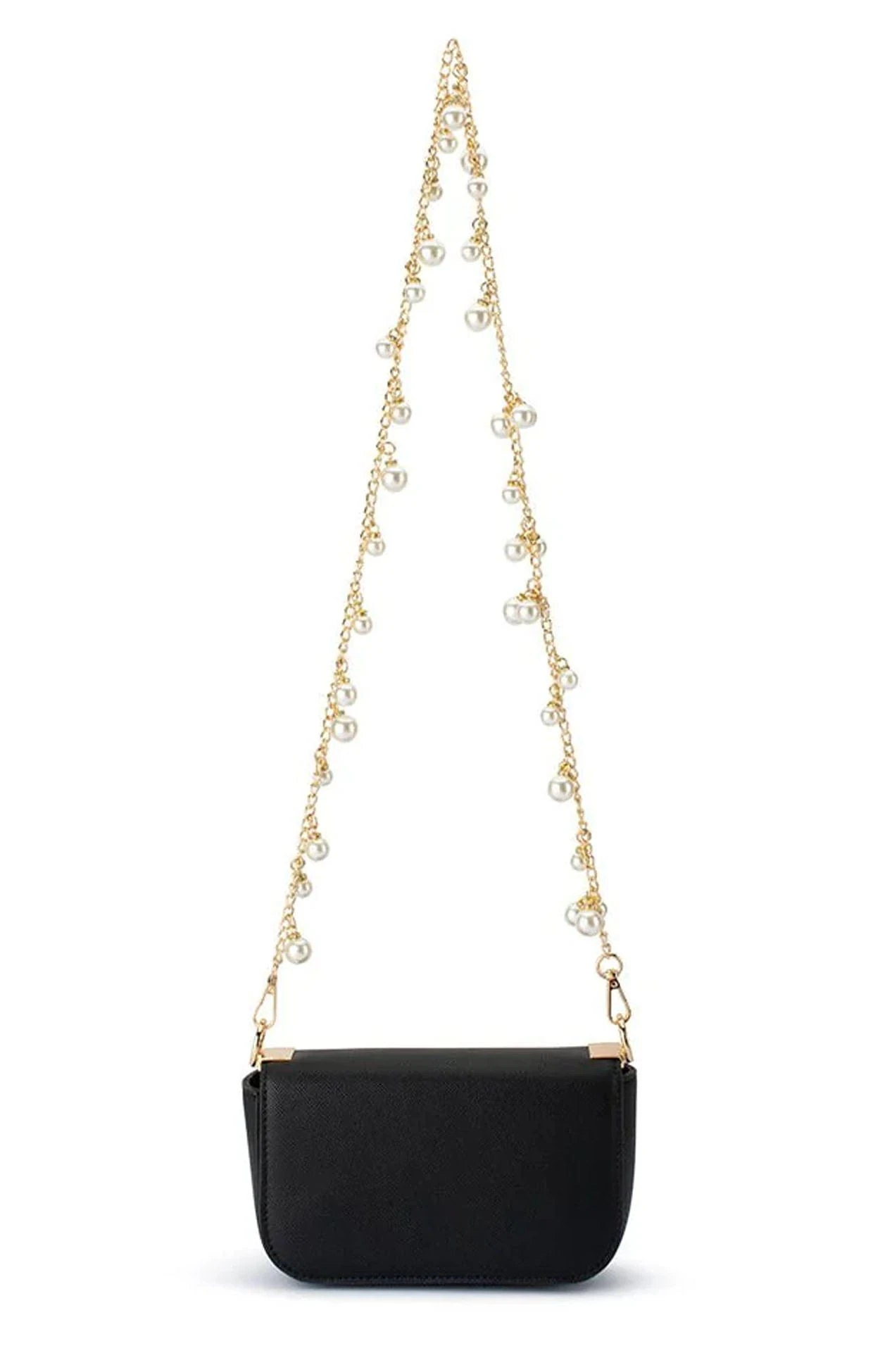 The Lyla Pearl Shoulder Bag by Olga Berg is a sophisticated accessory made from vegan leather, featuring a luxe faux pearl-embellished shoulder chain. With gold-tone hardware, a magnetic closure, and clutch styling options, it offers ample space for essentials, including a large smartphone, making it perfect for any occasion.
