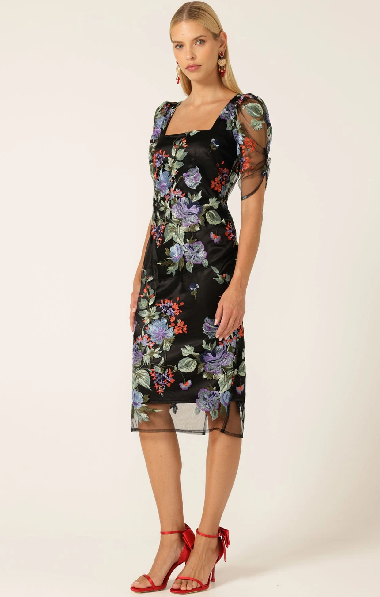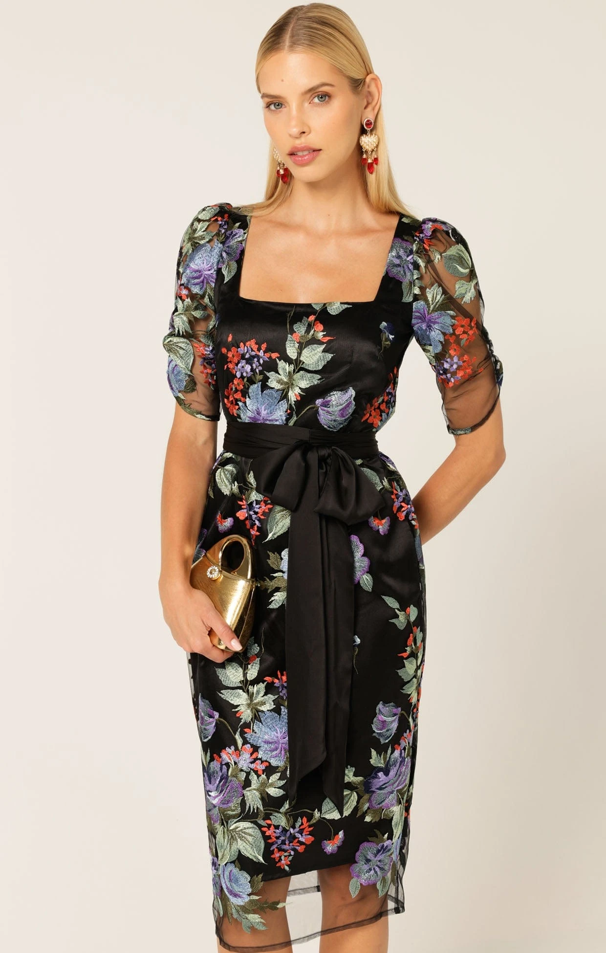 Step into elegance with the Mont Tombe Dress, perfect for weddings and events, featuring intricate embroidered floral lace mesh and a satin under slip. With longer puff sleeves, a detachable satin tie belt, relaxed waist, and a flattering midi-length silhouette, it’s effortlessly chic.