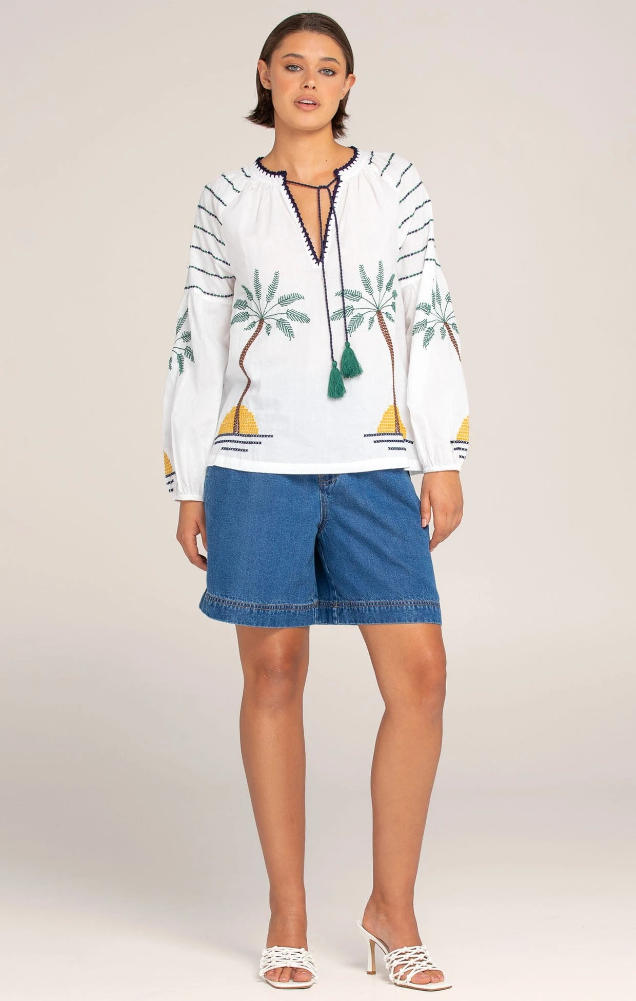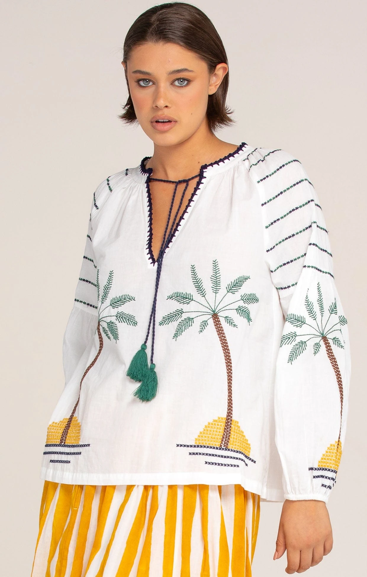 Crafted from light and airy 100% cotton, the Palm Embroidered Shirt from Boom Shankar will have you turning heads with intricate and colourful embroidery on a clean white base. Billowing sleeves and a relaxed fit make this shirt comfortable and breezy for summer, while tasselled neck ties add artisanal flair.