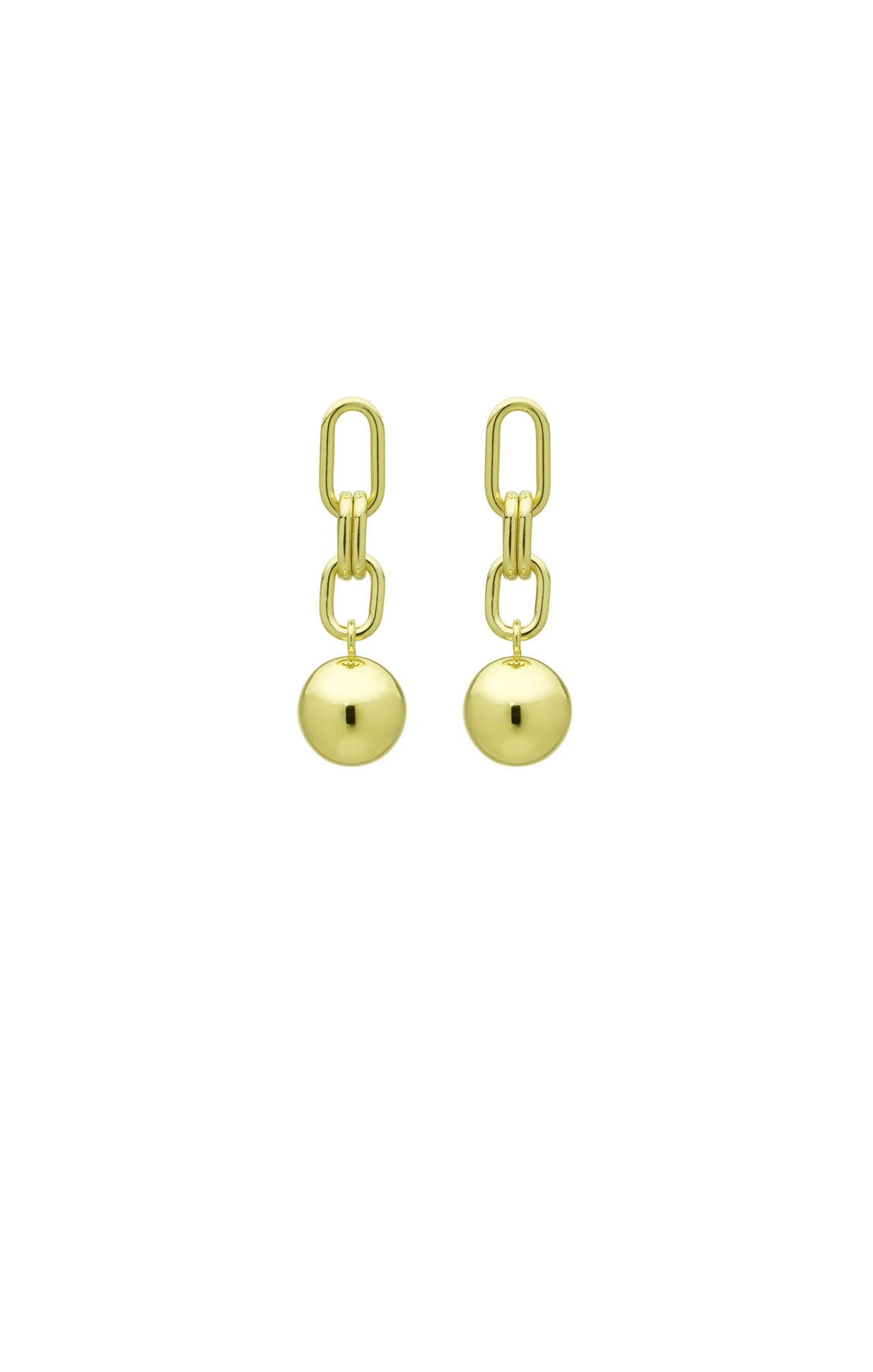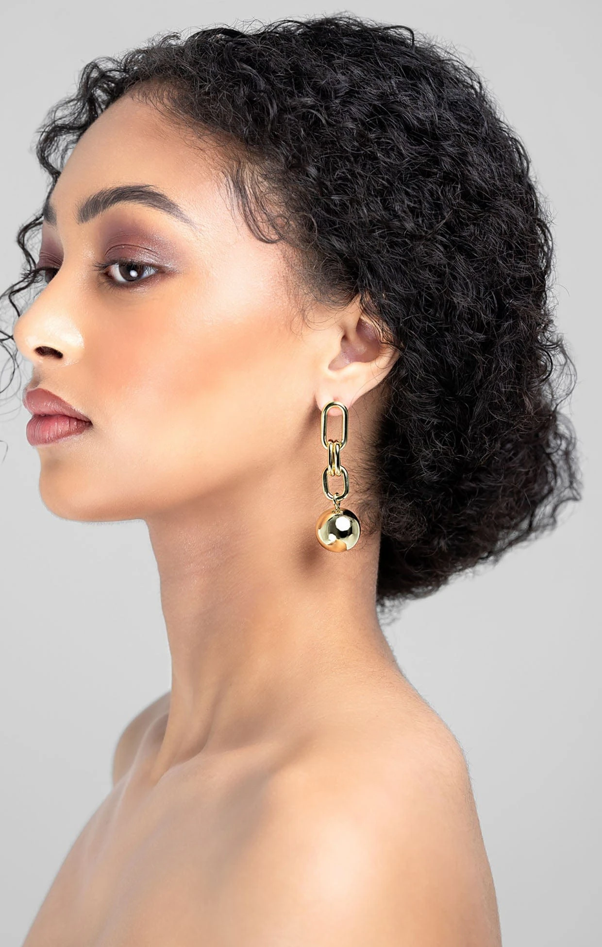 Elevate your look with this bold, modern statement earring featuring a striking 5.5cm drop. Microplated in gold, the design pairs sculptural chain and ball detailing for a contemporary edge. Crafted with nickel-free materials and stainless steel posts, these earrings are perfect for all-day wear and standout styling.