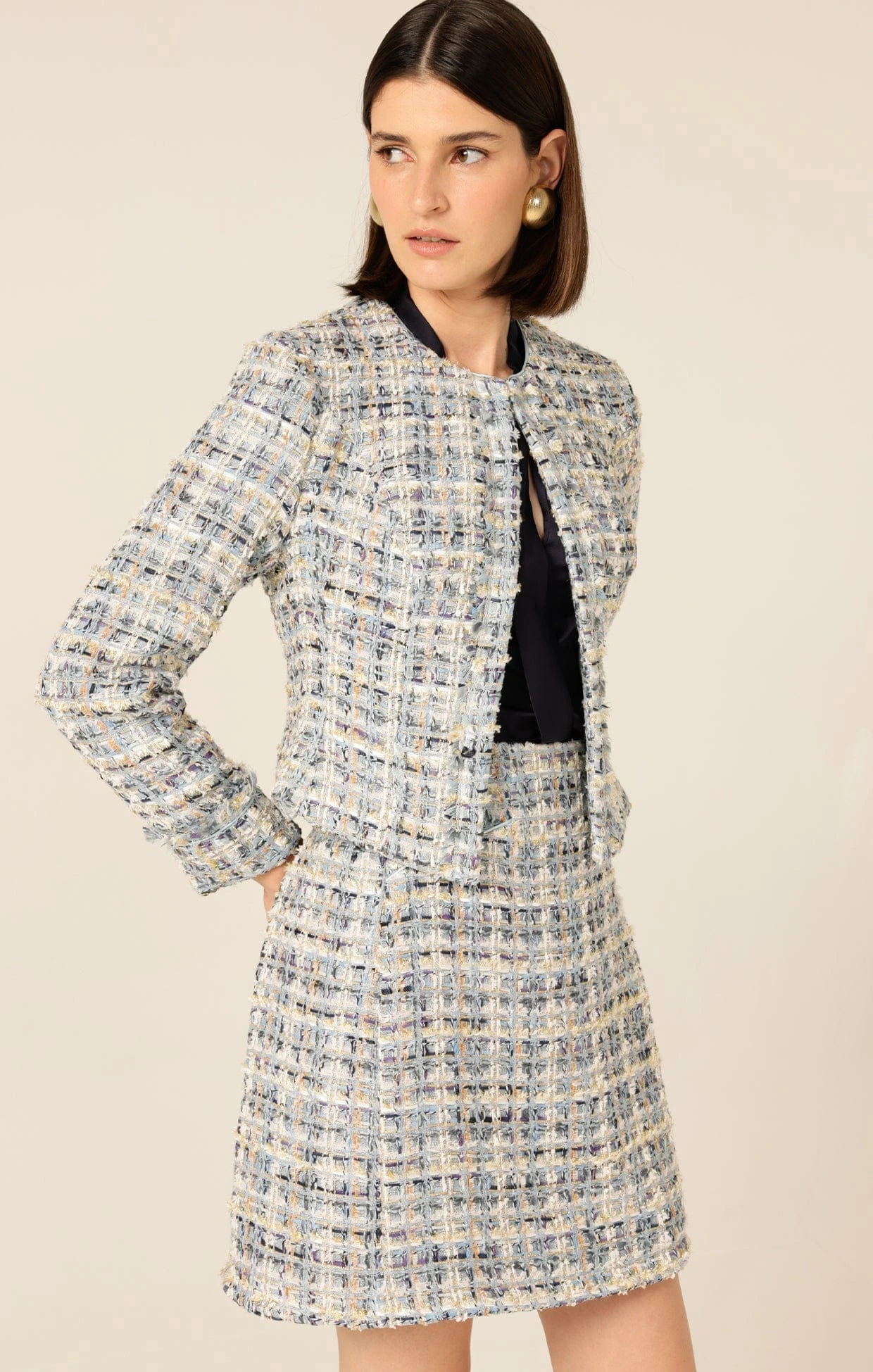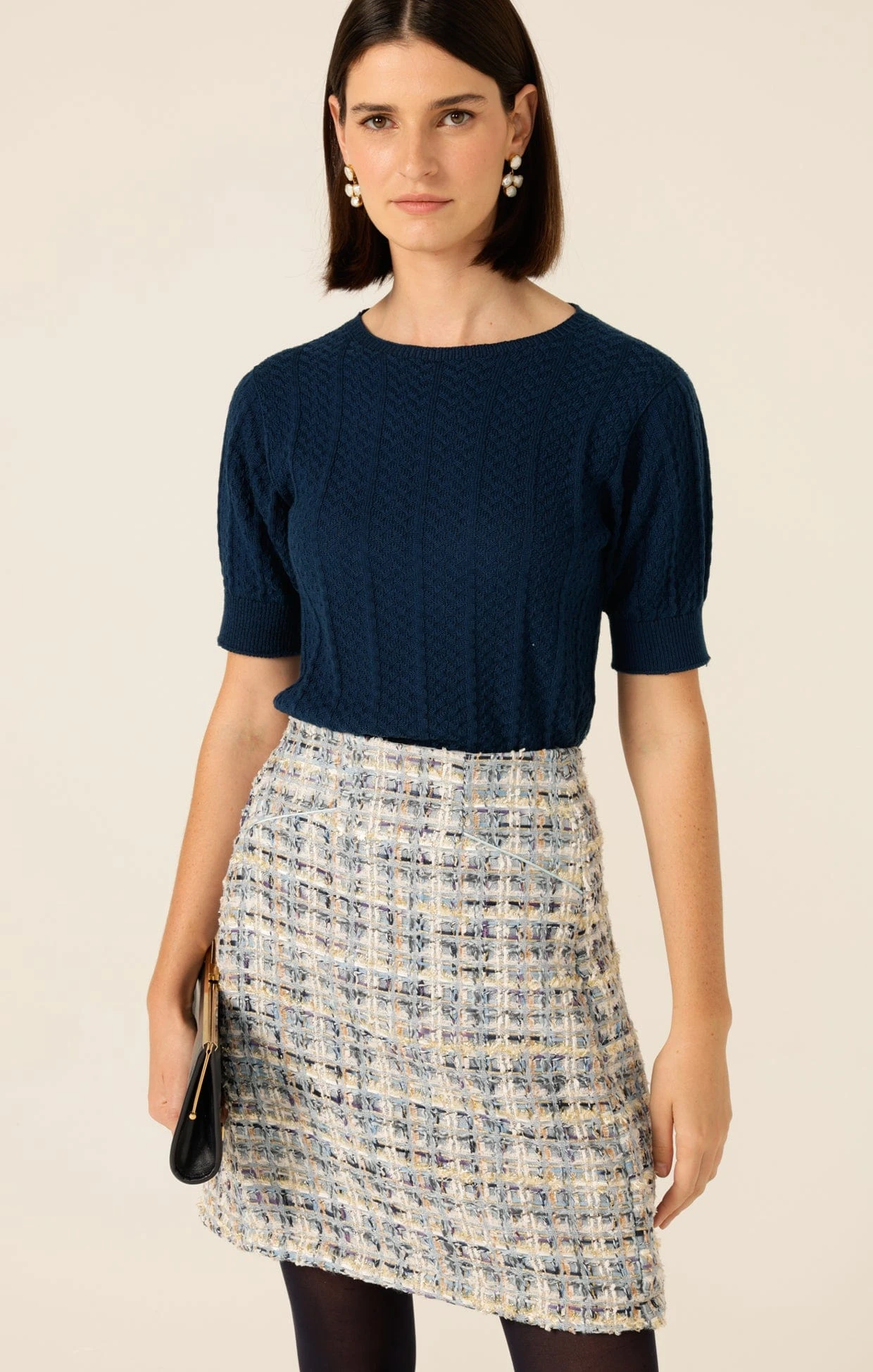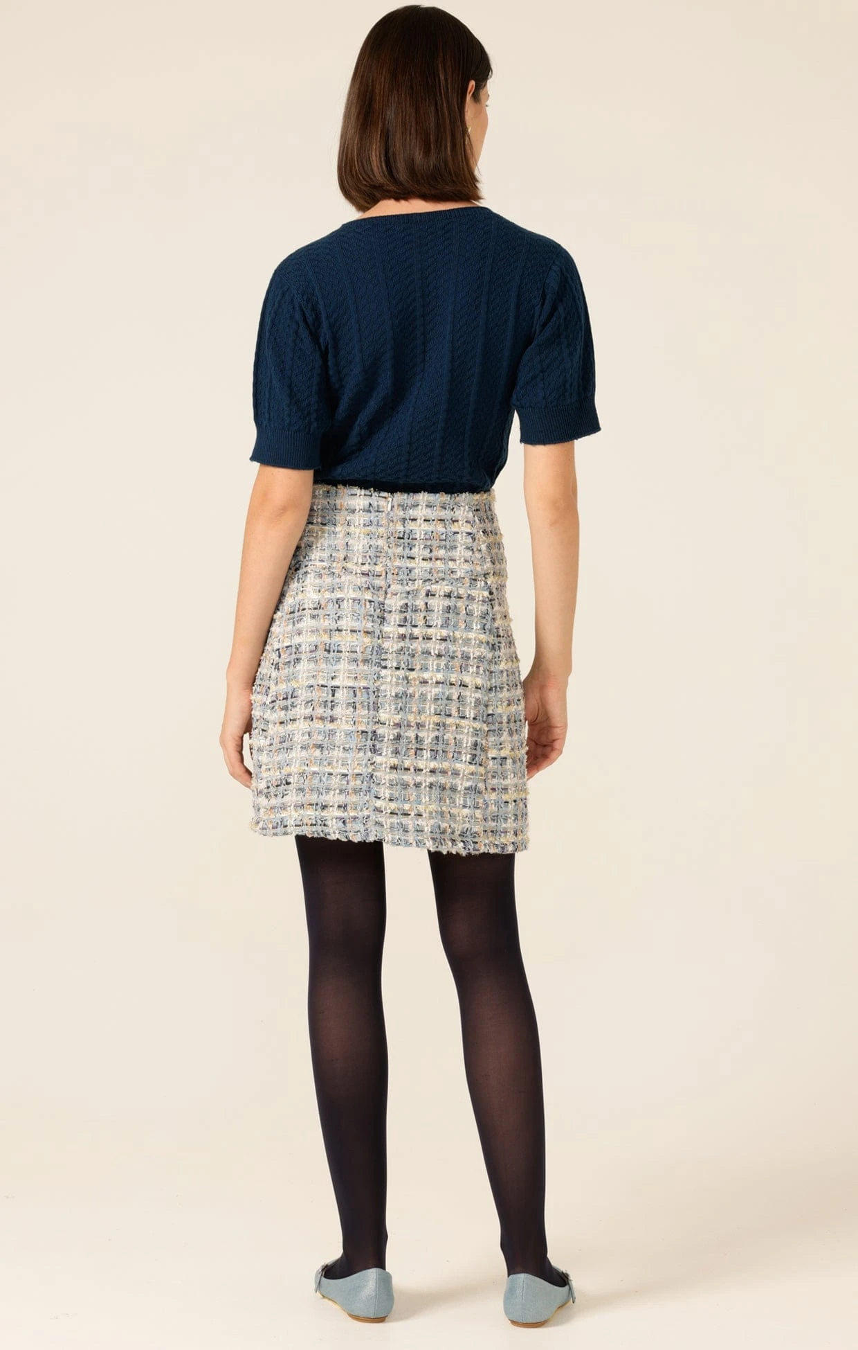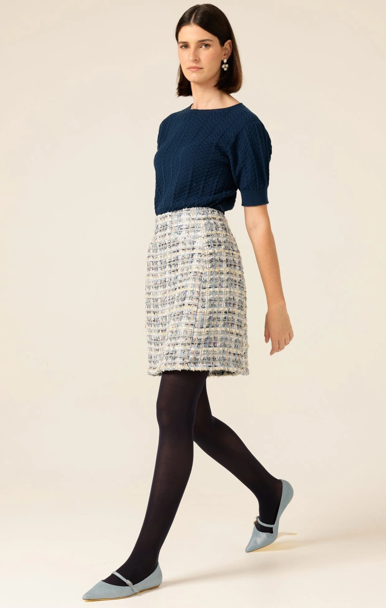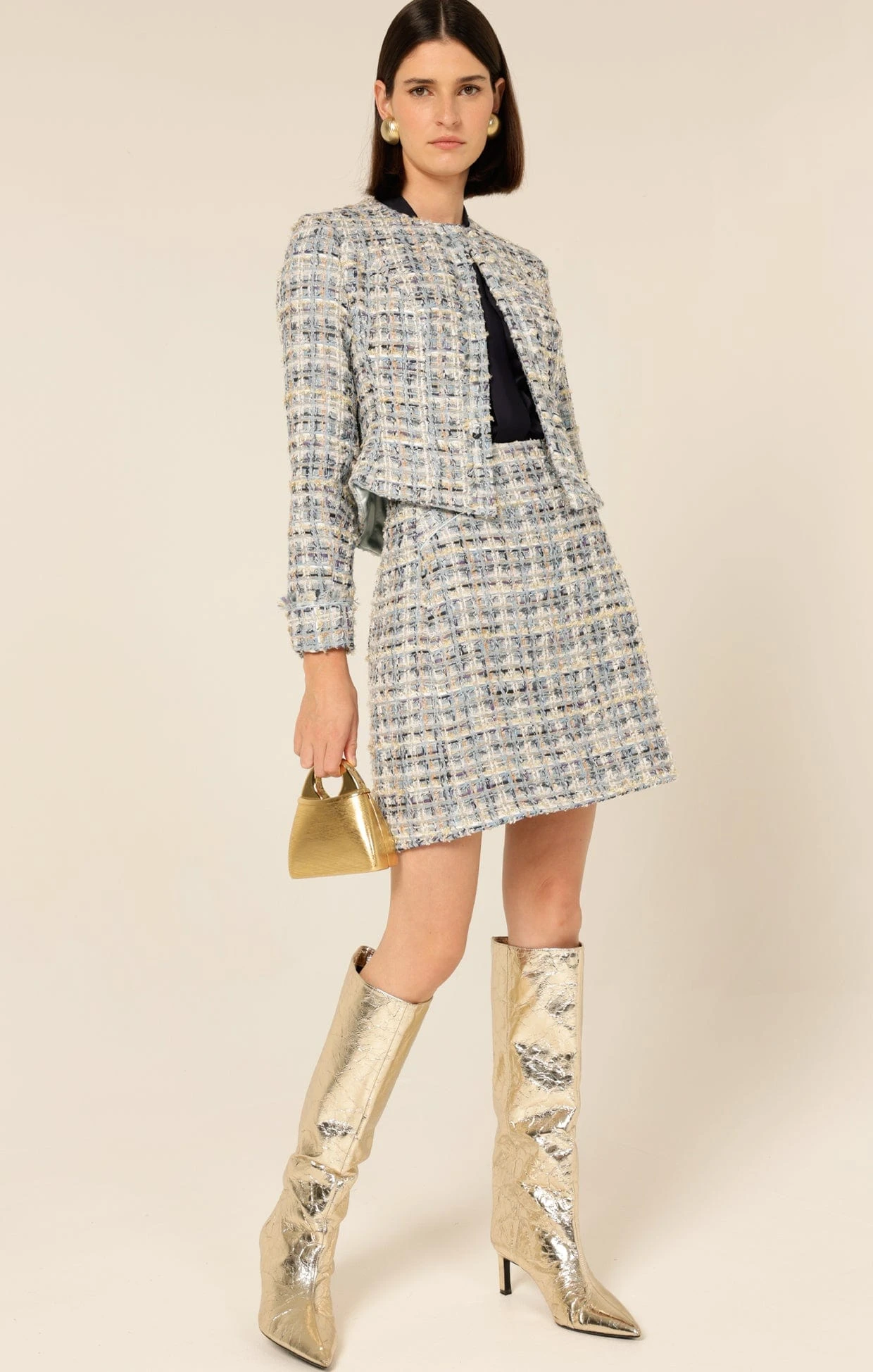 The Pixie Peak Mini Skirt adds a touch of elegance to your work and event wardrobe with its tweed fabrication and gold metallic accents. Fully lined for comfort, it features an invisible back zip, piped faux pocket detailing, and a chic above-knee length.