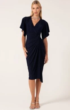 A signature SACHA DRAKE style, the Emporium Dress is ideal for events, crafted from luxurious stretch lurex jersey with a flattering V-neckline. The front knot detail adds drape and shape, while the elastic waist and fluted cap sleeves ensure comfort and sophistication.